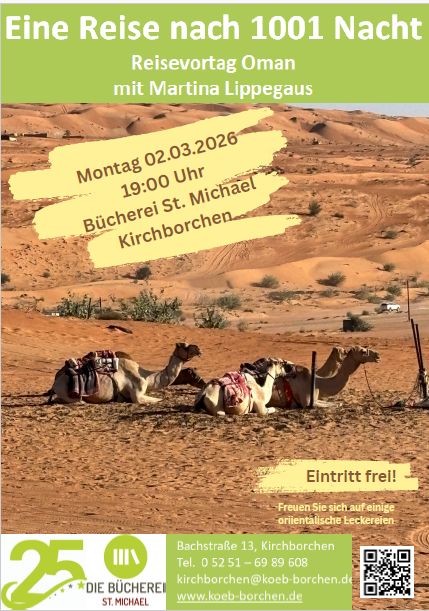 Zum Start ins Jubiläumsjahr stehen gleich drei Veranstaltungen an: Sonntag 08.02.2026 15:30 Uhr St. Michael Kirchborchen, Lesung in Kooperation mit der KFD St. Michael, 02.03.2026 Reisevortrag Oman, 15.03.2026 Ein Nachmittag mit einem Roboter.
