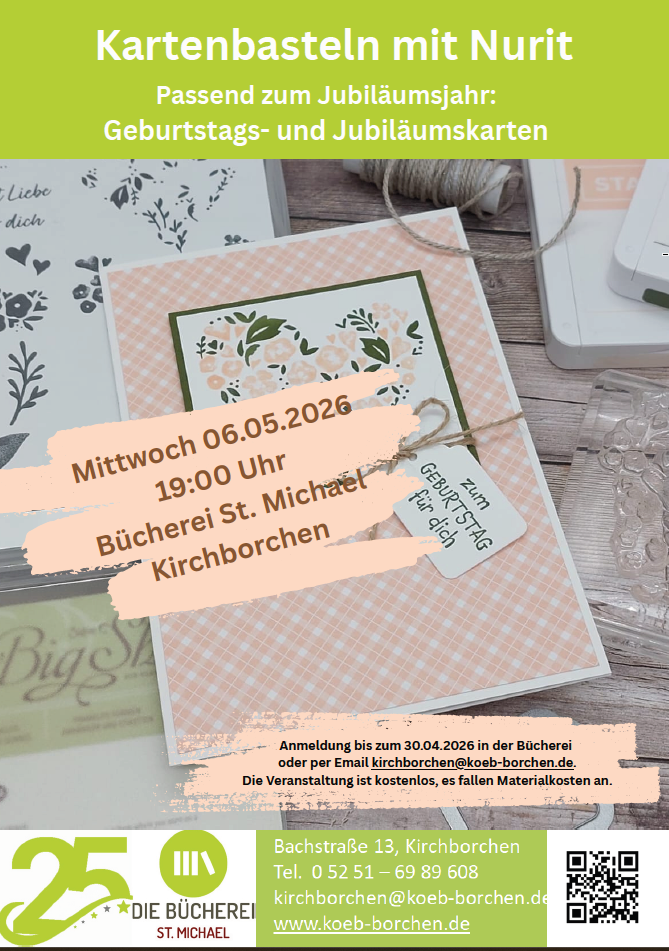 Passend zum 25 jährigen Jubiläum der Bücherei in Kirchborchen bieten wir in diesem Jahr an, gemeinsam Jubiläums und Geburtstagskarten zu basteln. Die Veranstaltung steht wieder unter der bewährten Leitung von Nurit Kloppenburg.